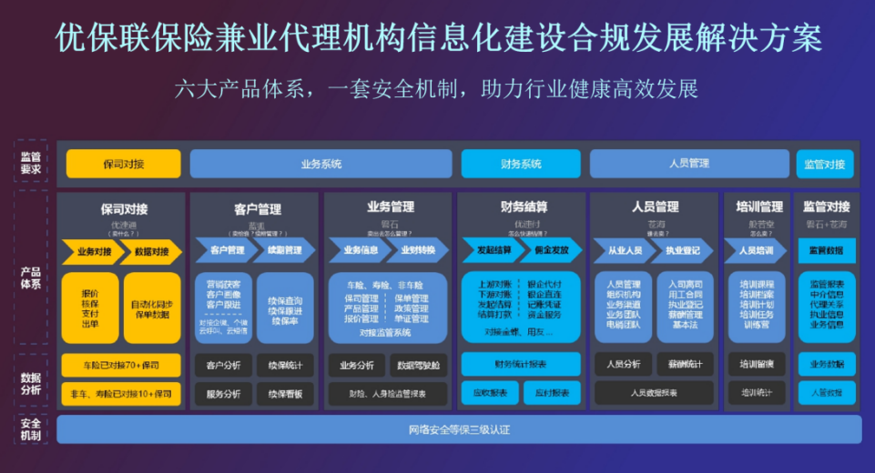 当然,优保联作为一家国内领先的保险科技公司,深耕保险科技5年之久,仅仅达成合规监管是远远不够的。优保联基于对保险行业的深刻理解与深厚的技术沉淀,赋能保险行业,倾力打造全域保险智能云平台,是为了实现“保险与科技更紧密连接、保险业上下游更全面连接、保险与金融更深层连接”,帮助